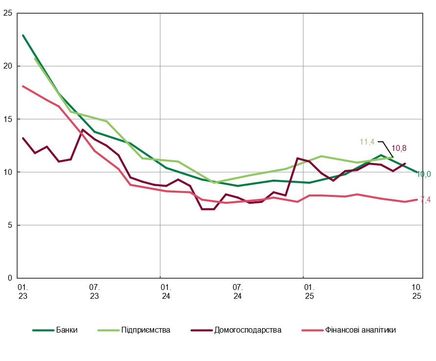 Згідно з Інфляційним звітом за жовтень 2025 року, очікування домогосподарств, бізнесу та фінансових установ суттєво різняться. Попри те, що аналітики й банки дещо покращили свої прогнози, очікування населення залишаються помітно вищими.